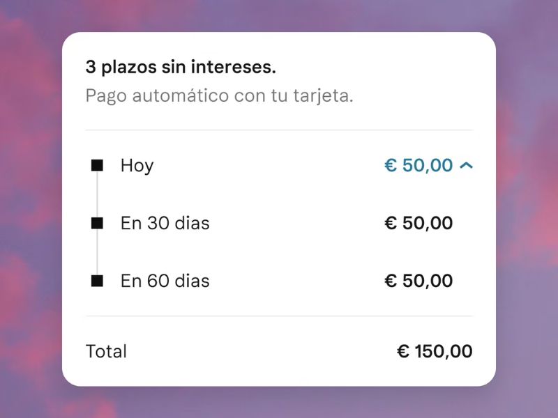Se te cobrará un plazo cada mes hasta que se complete el importe total de la compra de tu Bono Parques. Klarna te notificará con antelación cada cobro para que añadas dinero a tu tarjeta si fuese necesario.